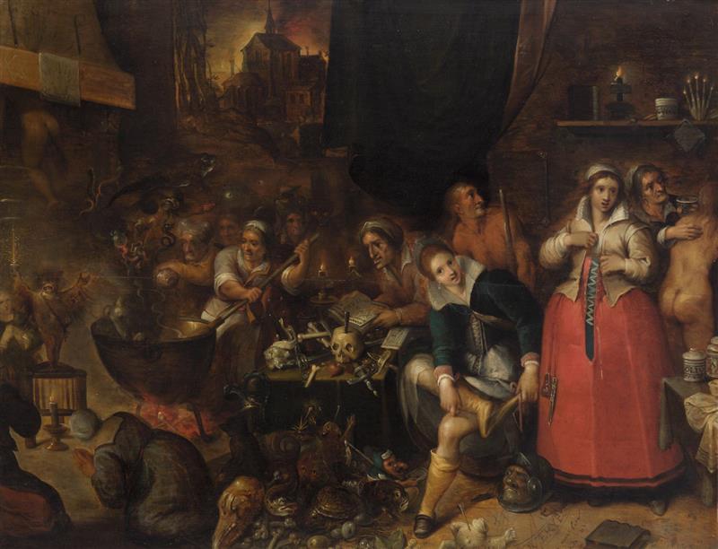 Das Gemälde "A Witches' Kitchen" von Frans Francken als hochwertige, handgemalte Ölgemälde-Replikation.