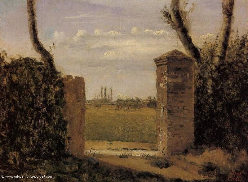 Das Gemälde "Boid Guillaumi near Rouen (A Gate Flanked by two Posts)" von Jean Baptiste Camille Corot als hochwertige, handgemalte Ölgemälde-Replikation.
