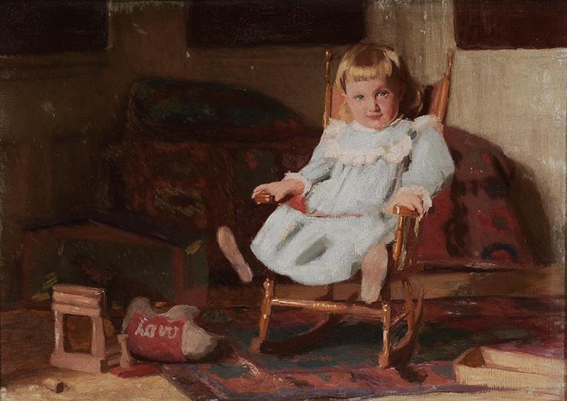 Das Gemälde "Child in a Blue Dress in a Chair" von Thomas Pollock Anshutz als hochwertige, handgemalte Ölgemälde-Replikation.