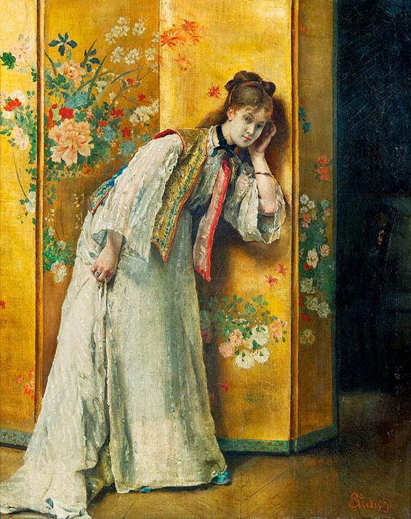 Das Gemälde "Curious" von Alfred Emile Stevens als hochwertige, handgemalte Ölgemälde-Replikation.