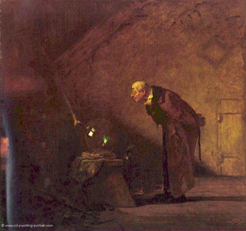 Das Gemälde "Der Alchimist" von Carl Spitzweg als hochwertige, handgemalte Ölgemälde-Replikation.