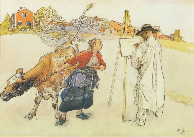 Das Gemälde "Der Hof (Johanna mit dem Kalb vor Spardavet)" von Carl Larsson als hochwertige, handgemalte Ölgemälde-Replikation.