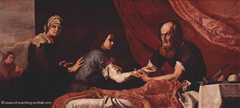 Das Gemälde "Der blinde Isaak segnet Jacob" von Jusepe de Ribera als hochwertige, handgemalte Ölgemälde-Replikation.