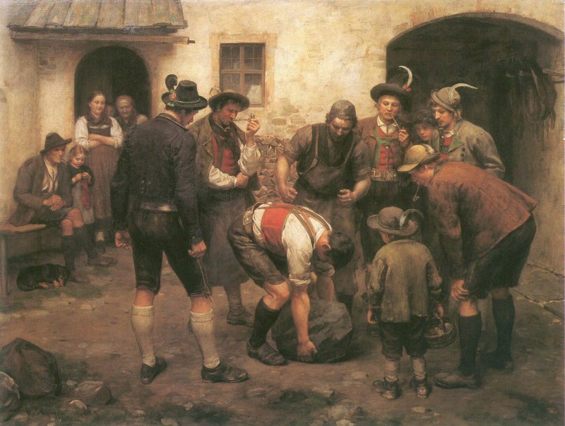 Das Gemälde "Die Kraftprobe" von Franz von Defregger als hochwertige, handgemalte Ölgemälde-Replikation.