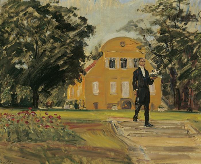 Das Gemälde "Diener auf Terrasse Neu-Cladow" von Max Slevogt als hochwertige, handgemalte Ölgemälde-Replikation.