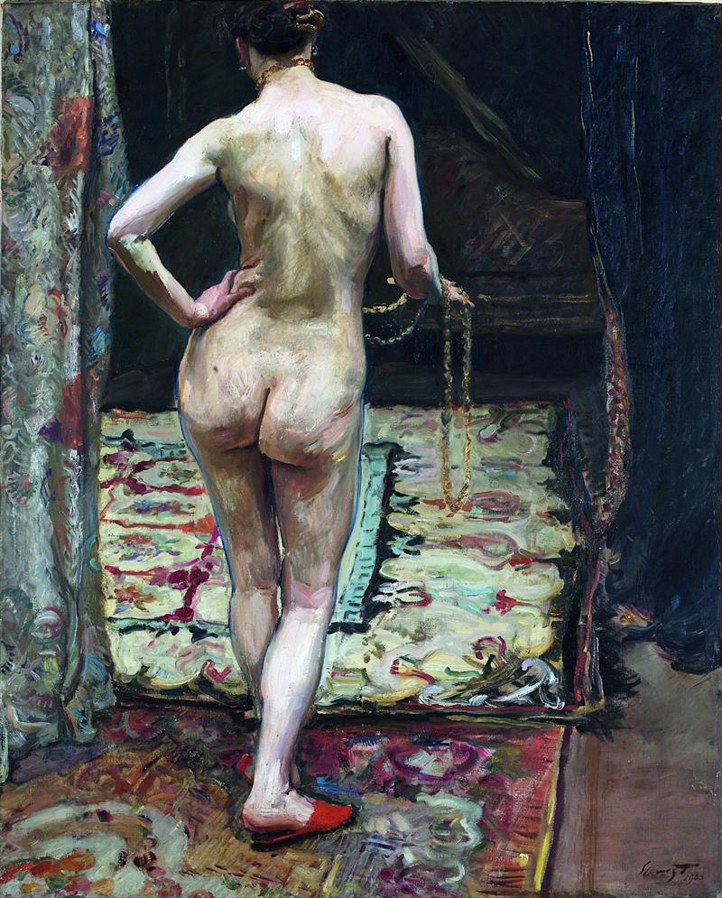 Das Gemälde "Female Nude from the Back" von Max Slevogt als hochwertige, handgemalte Ölgemälde-Replikation.