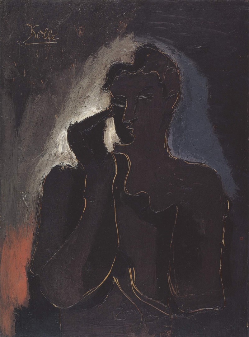 Das Gemälde "Halbakt mit erhobener rechter Hand" von Helmut Kolle als hochwertige, handgemalte Ölgemälde-Replikation.