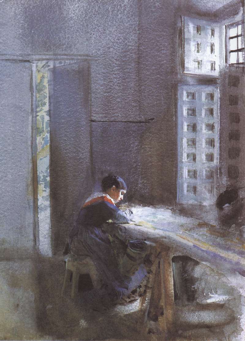 Das Gemälde "Interieur einer Tapisseriefabrik in Madrid" von Anders Zorn als hochwertige, handgemalte Ölgemälde-Replikation.