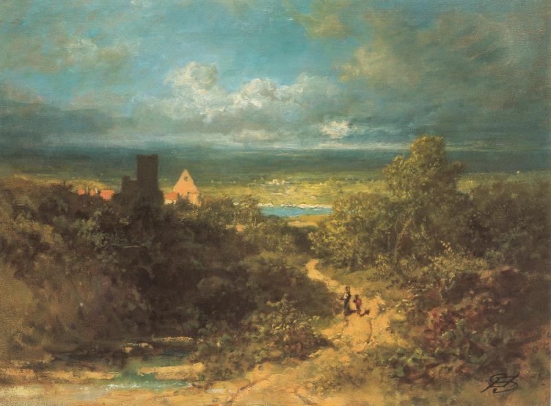 Das Gemälde "Landschaft mit Ruine" von Carl Spitzweg als hochwertige, handgemalte Ölgemälde-Replikation.