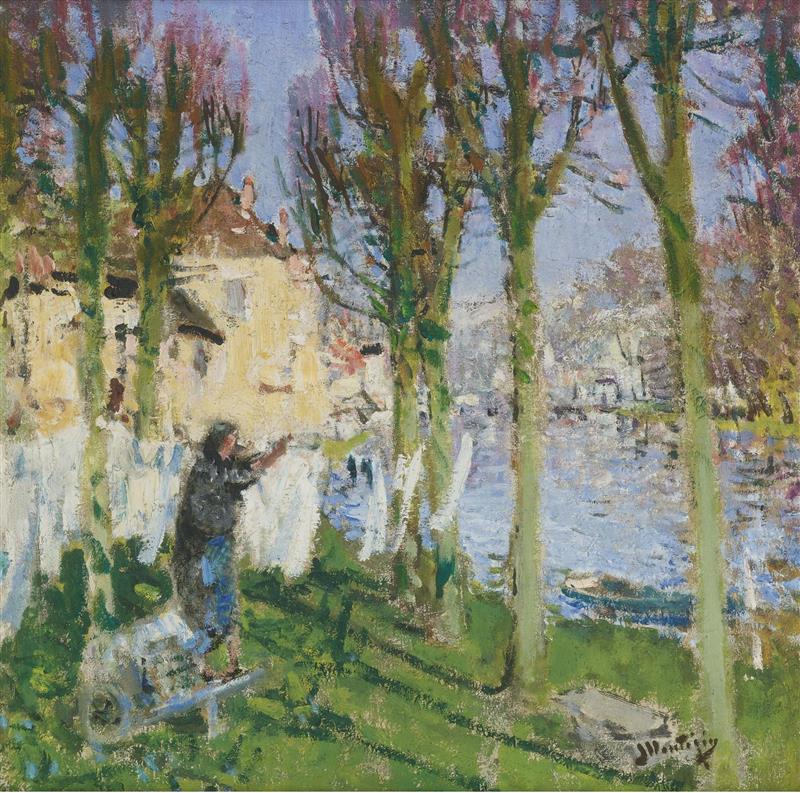 Das Gemälde "Laundress Hanging Washing" von Pierre-Eugène Montézin als hochwertige, handgemalte Ölgemälde-Replikation.