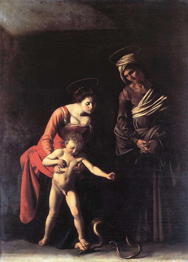 Das Gemälde "Madonna with Serpant" von Michelangelo Caravaggio als hochwertige, handgemalte Ölgemälde-Replikation.