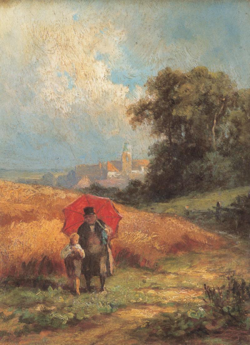 Das Gemälde "Mann mit rotem Sonnenschirm und Bauernbub" von Carl Spitzweg als hochwertige, handgemalte Ölgemälde-Replikation.