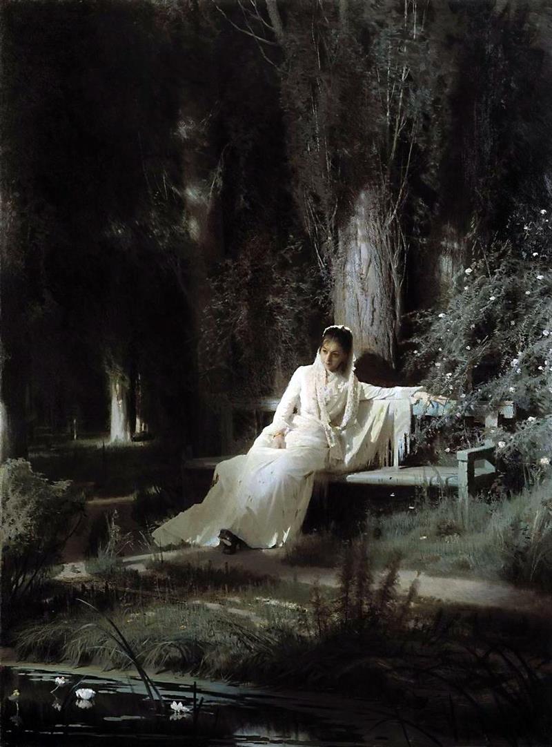 Das Gemälde "Moonlit Night" von Iwan Nikolajewitsch Kramskoi als hochwertige, handgemalte Ölgemälde-Replikation.