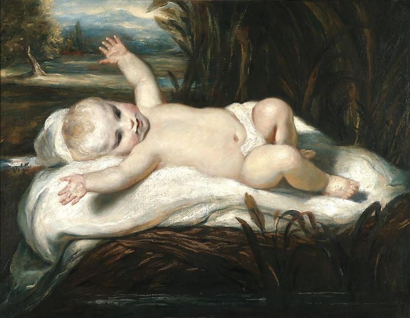 Das Gemälde "Moses in the Bullrushes" von Joshua Reynolds als hochwertige, handgemalte Ölgemälde-Replikation.