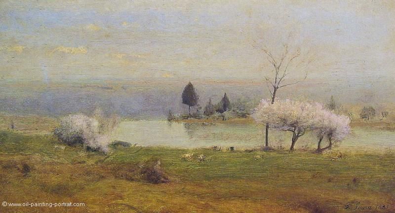 Das Gemälde "Pont at a Miton on the Hudson" von George Inness als hochwertige, handgemalte Ölgemälde-Replikation.
