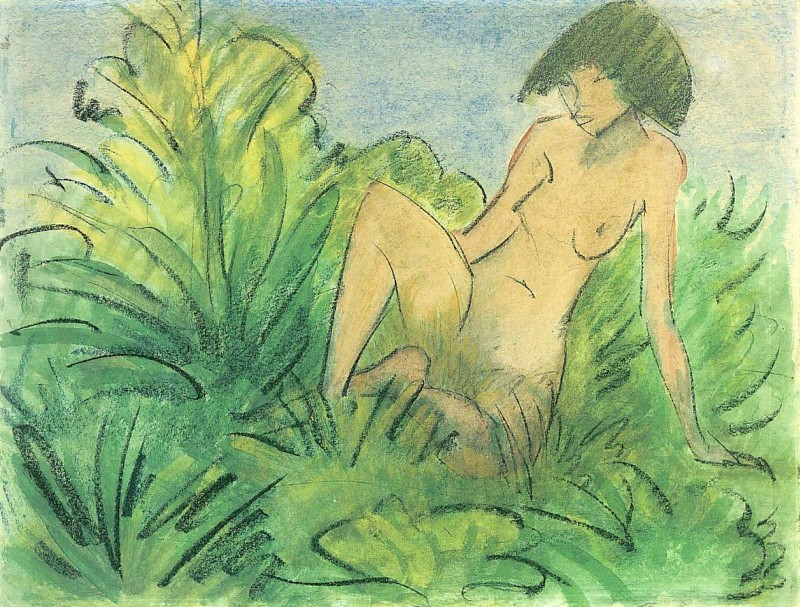 Das Gemälde "Sitzende im hohen Gras" von Otto Mueller als hochwertige, handgemalte Ölgemälde-Replikation.