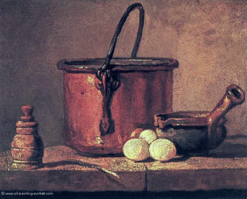 Das Gemälde "Still Life with Copper Cauldron and Eggs" von Jean Simeon Chardin als hochwertige, handgemalte Ölgemälde-Replikation.