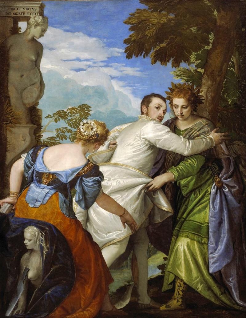 Das Gemälde "The Choice Between Virtue and Vice" von Paolo Veronese als hochwertige, handgemalte Ölgemälde-Replikation.
