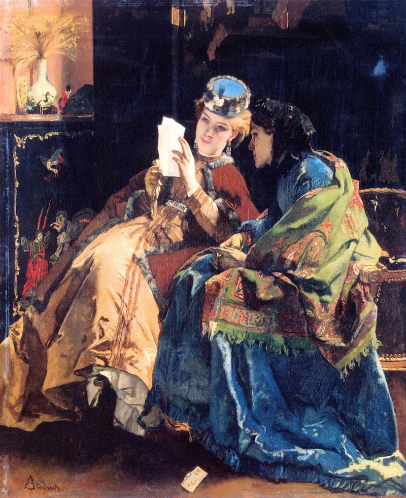 Das Gemälde "The Letter" von Alfred Emile Stevens als hochwertige, handgemalte Ölgemälde-Replikation.