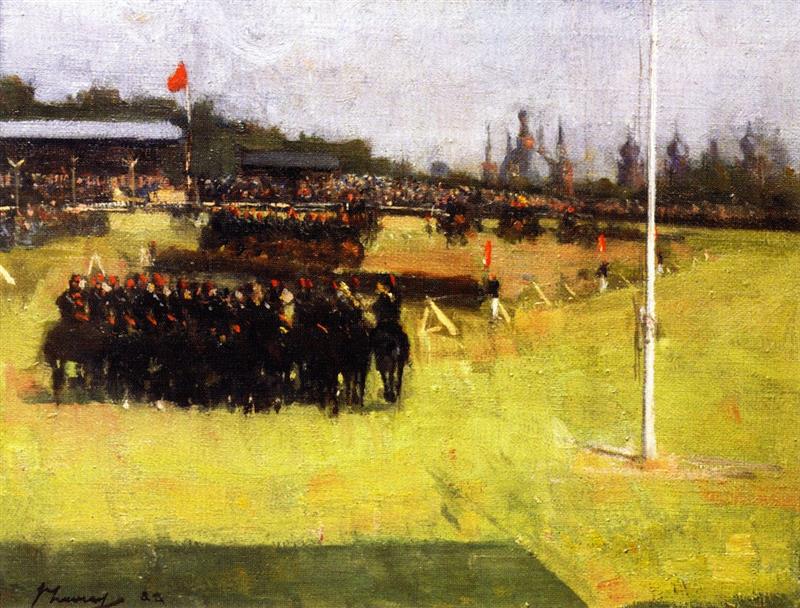 Das Gemälde "The Musical Ride of the 15th Hussars during Military Tournament, Glasgow International Exhibition" von John Lavery als hochwertige, handgemalte Ölgemälde-Replikation.