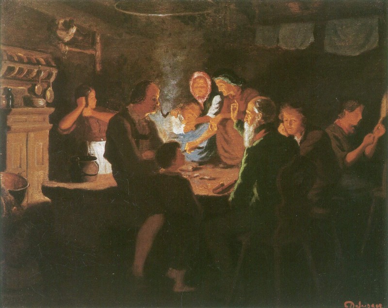 Das Gemälde "Um den Herd" von Franz von Defregger als hochwertige, handgemalte Ölgemälde-Replikation.