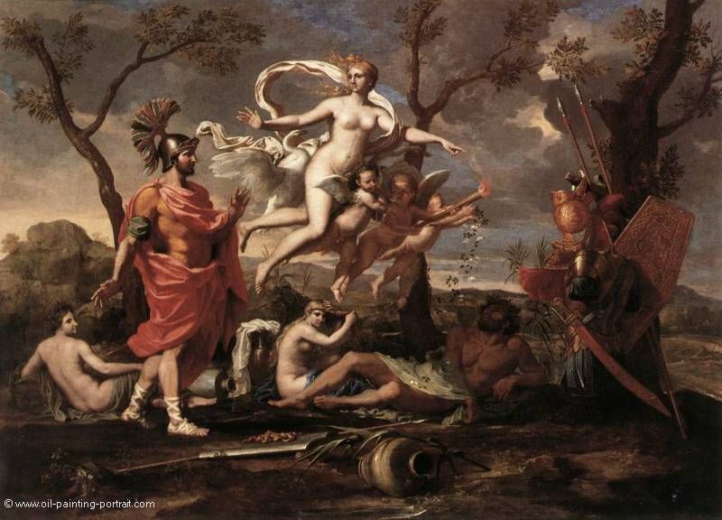Das Gemälde "Venus Presenting Arms to Aeneas" von Nicolas Poussin als hochwertige, handgemalte Ölgemälde-Replikation.