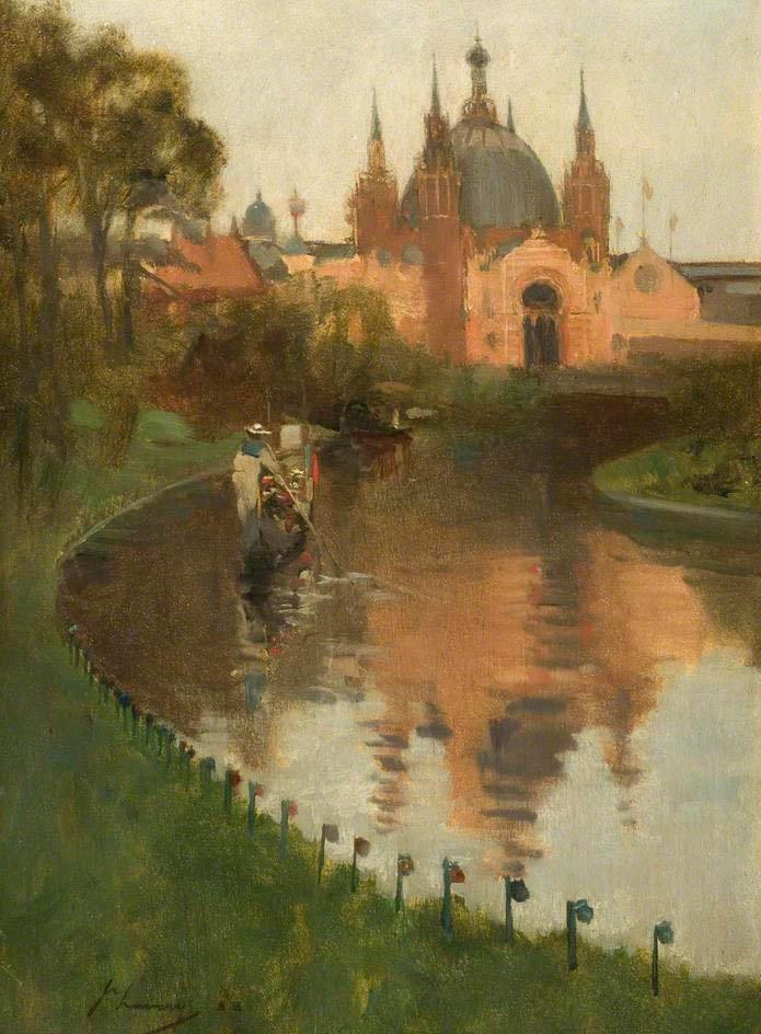 Das Gemälde "View from the Canal of the Industrial Hall, Kelvingrove, at the First International Exhibition" von John Lavery als hochwertige, handgemalte Ölgemälde-Replikation.