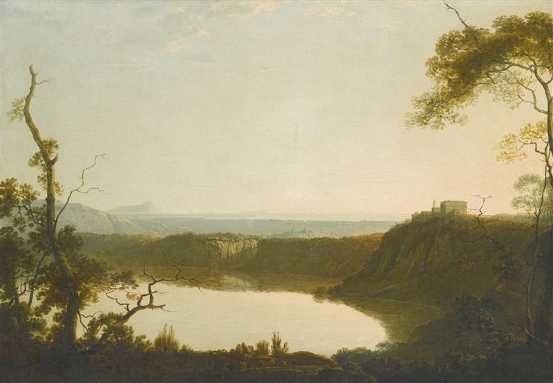 Das Gemälde "View of Lake Nemi" von Joseph Wright of Derby als hochwertige, handgemalte Ölgemälde-Replikation.