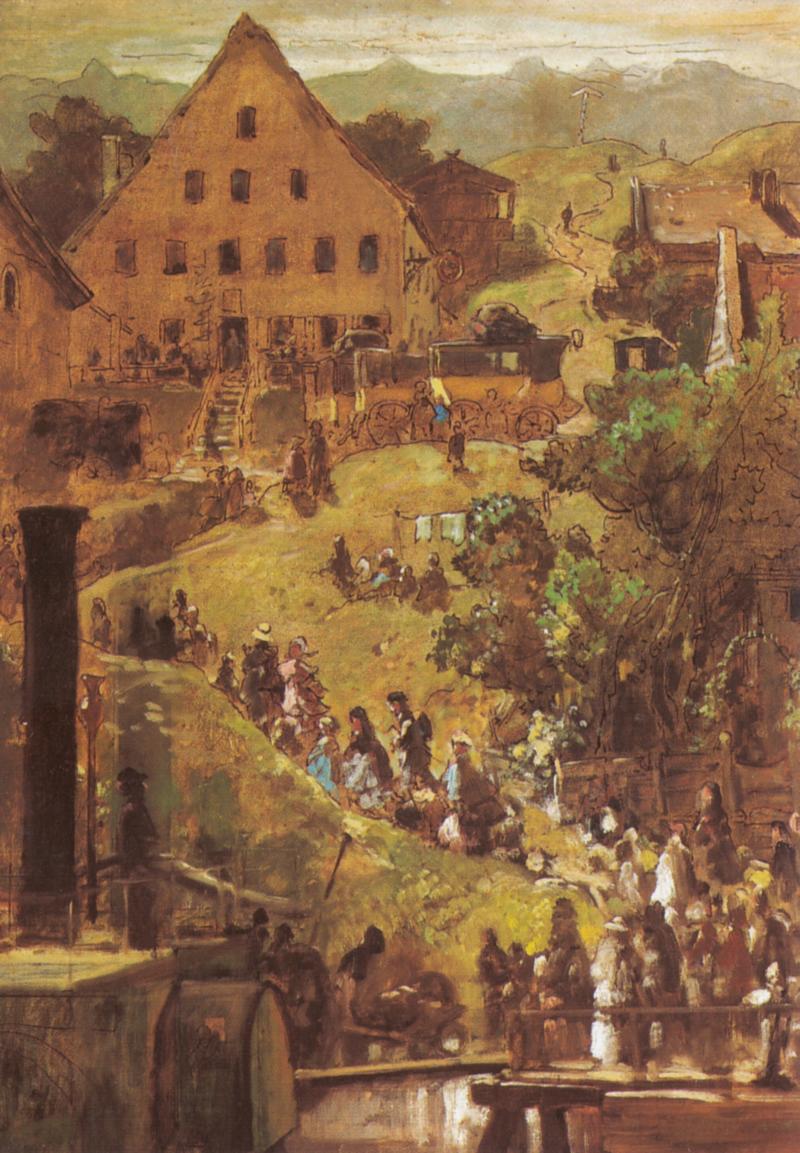 The painting "Ankunft in Seehaupt" from the artist Carl Spitzweg as high-quality, hand-painted oil painting replication.