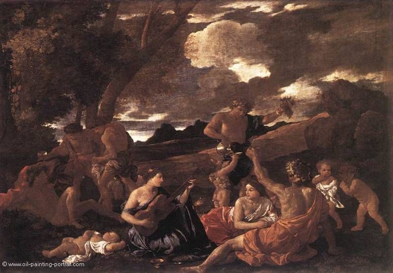 The painting "Bacchanal (The Andrians)" from the artist Nicolas Poussin as high-quality, hand-painted oil painting replication.