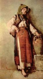 The painting "Baeuerin mit Krug" from the artist Nicolae Grigorescu as high-quality, hand-painted oil painting replication.