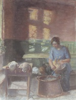 The painting "Beim Huehnerrupfen" from the artist Anna Ancher as high-quality, hand-painted oil painting replication.