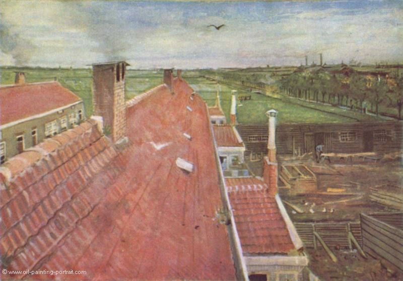 The painting "Daecher, Blick vom Atelier van Goghs am Schenkweg" from the artist Vincent Willem van Gogh as high-quality, hand-painted oil painting replication.