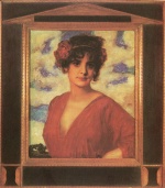 The painting "Dame in Rot" from the artist Franz von Stuck as high-quality, hand-painted oil painting replication.