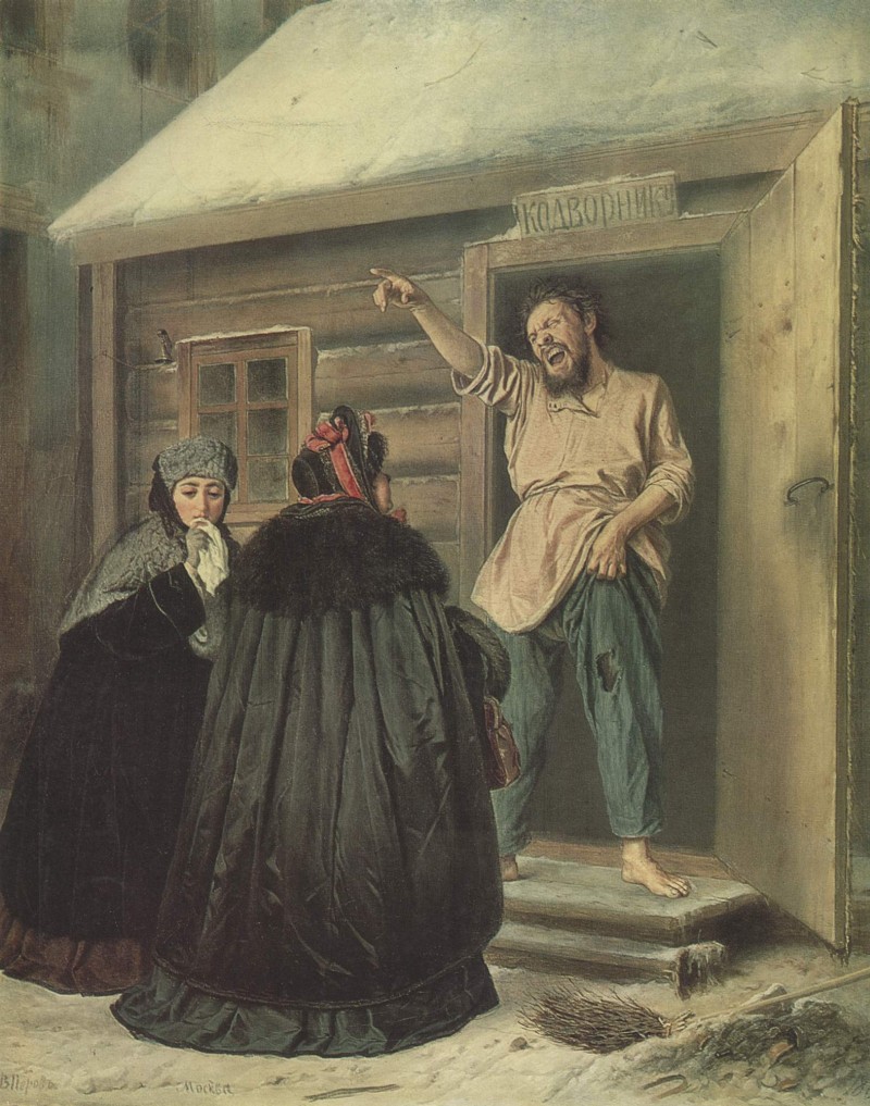 The painting "Der Hauswart vermietet einer Dame eine Wohnung" from the artist Wassilij Grigorjewitsch Perow as high-quality, hand-painted oil painting replication.