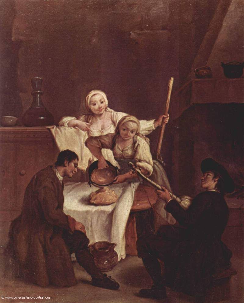 The painting "Die Polenta" from the artist Pietro Longhi as high-quality, hand-painted oil painting replication.