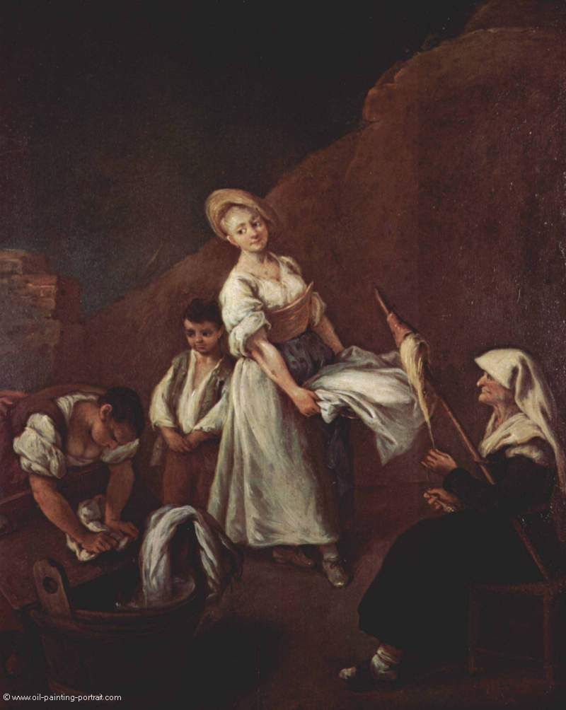 The painting "Die Waescherinnen" from the artist Pietro Longhi as high-quality, hand-painted oil painting replication.