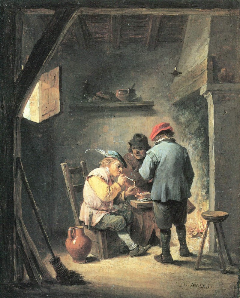The painting "Drei Bauern beim Feuer" from the artist David Teniers as high-quality, hand-painted oil painting replication.