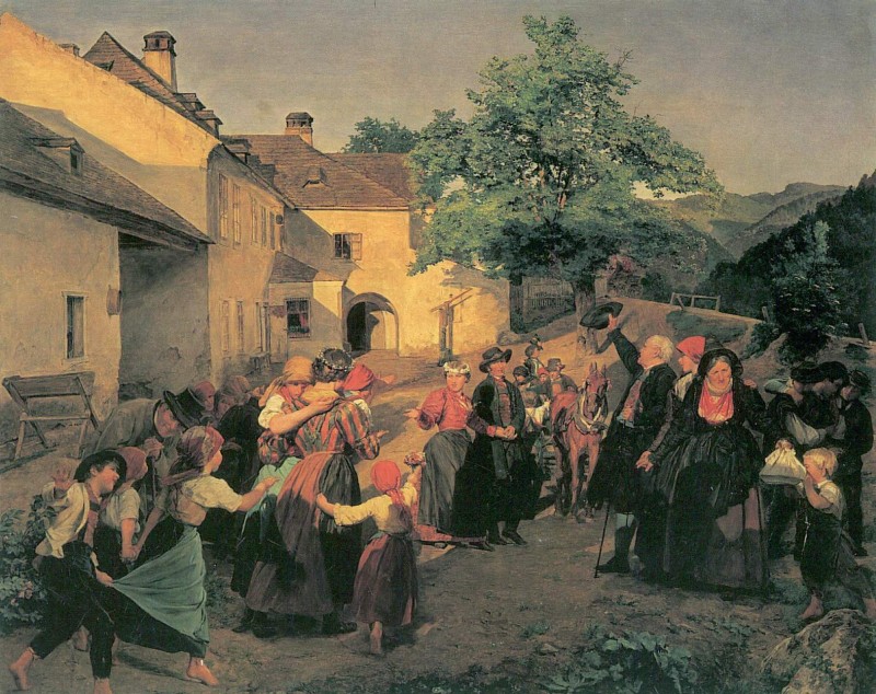 The painting "Heimkehr nach der Hochzeit, Abschied der Braut von ihren Gespielen" from the artist Ferdinand Georg Waldmueller as high-quality, hand-painted oil painting replication.
