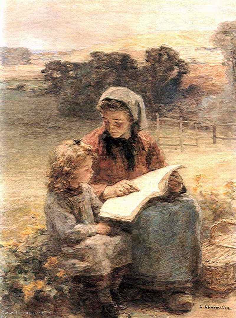 The painting "La Lecon de lecture" from the artist Leon Augustin Lhermitte as high-quality, hand-painted oil painting replication.