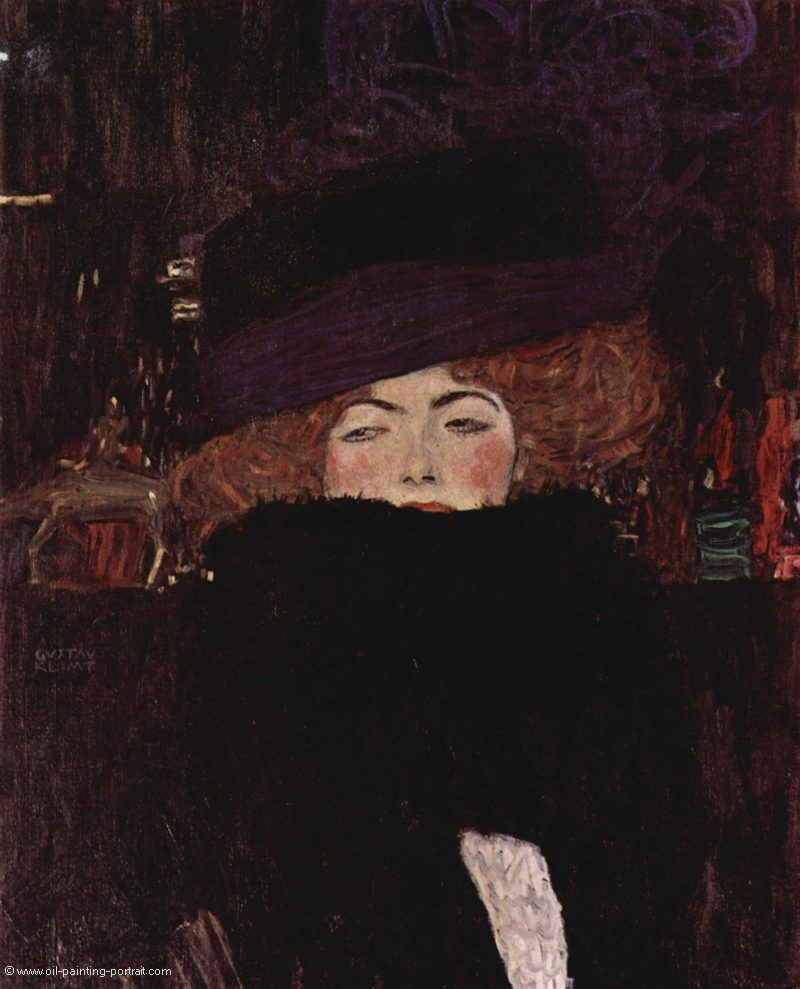 The painting "Lady with Hat and Featherboa" from the artist Gustav Klimt as high-quality, hand-painted oil painting replication.