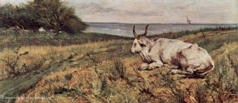 The painting "Liegende Kuh" from the artist Giovanni Fattori as high-quality, hand-painted oil painting replication.
