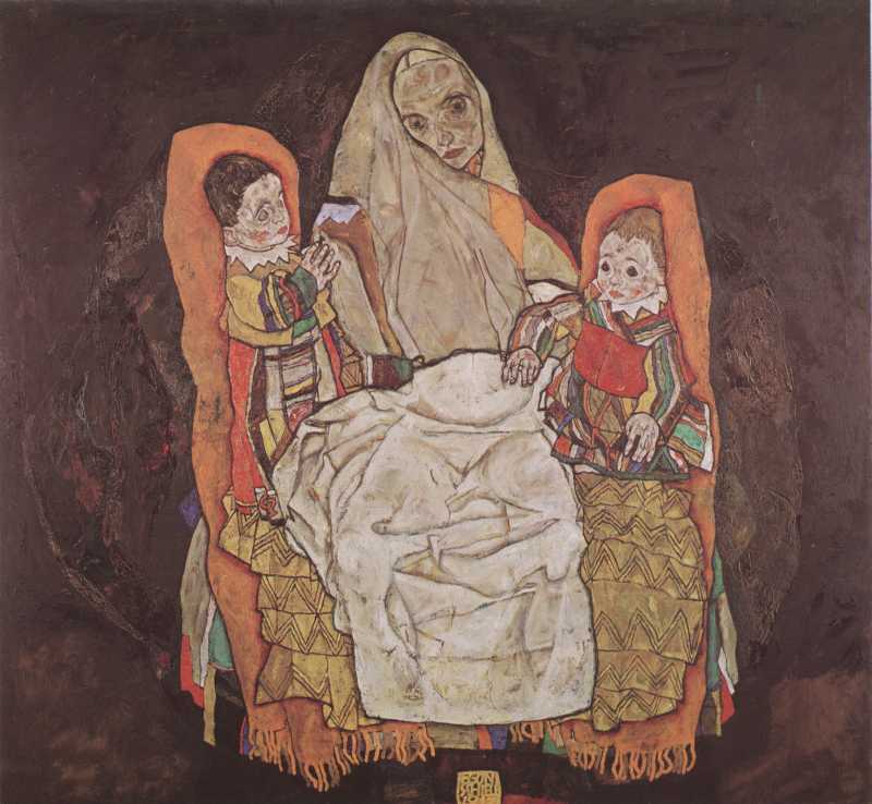 The painting "Mother with two Children" from the artist Egon Schiele as high-quality, hand-painted oil painting replication.