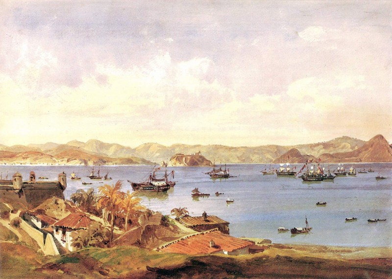 The painting "Panorama von Rio de Janeiro aufgenommen von der Ilha das Cobras" from the artist Eduard Hildebrandt as high-quality, hand-painted oil painting replication.