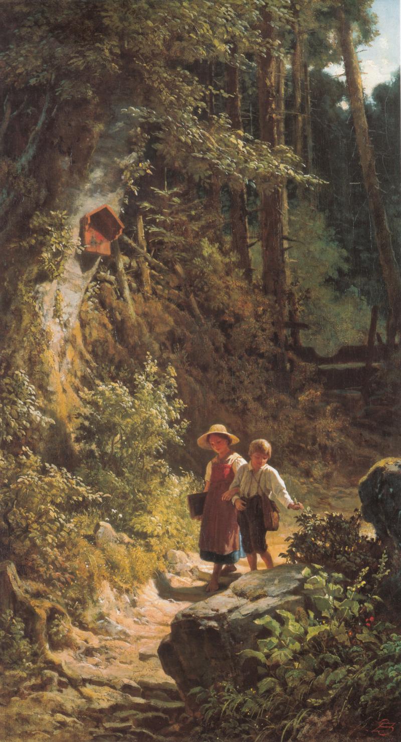 The painting "Schulkinder im Walde" from the artist Carl Spitzweg as high-quality, hand-painted oil painting replication.