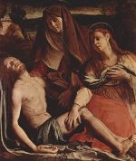 The painting "Toter Christus, Maria und Maria Magdalena" from the artist Angelo Bronzino as high-quality, hand-painted oil painting replication.