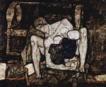 The Austrian painter and graphic artist Egon Schiele completes his art studies in the years 1906 to 1909 at the Vienna Academy. Molded by the art nouveau artist Gustav Klimt, by East Asian art, but also by the symbolist Hodler, Schiele's very own style develops from 1910 onwards towards Expressionism. In the following years, he paints landscapes and portraits, including immoral portraits of girls, which earns him an imprisonment for a short time in 1912. In addition to quotations on paintings by Gustav Klimt, Schiele also paints expressionist paintings on sculptures by Rodin. After his participation in the First World War, Egon Schiele's works testify even more of a strong distortion and tornness. The distorted bodies with their overstressed hands are expressions of the artist's personal experiences. From 1916, his style develops more towards realism and detail.