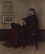 James Abbott McNeill Whistler (10 juillet 1834, Lowell – 17 juillet 1903, Londres), peintre et lithographe américain du XIXème siècle, connu aussi pour sa personnalité belliqueuse. Il arrive à Paris à l´âge de 21 ans, après avoir passé son enfance à Saint Pétersbourg où son père travaille comme ingénieur. Il est l´élève du peintre Charles Gleyre, qui a une influence sur son œuvre, mais ce sont surtout les toiles réalistes de ses amis Gustave Courbet et Henri Fantin-Latour qui vont le marquer. Accepté à la Royal Academy, il quitte Paris pour Londres où il met à la mode durant les décennies suivantes un style de vie presque dandy. Il aime beaucoup l´art japonais, proche en cela de la prédilection des Sécessionnistes viennois. A partir des années 1860 il commence à composer ses peintures sur la base d´associations de couleurs proches. Il réalise alors des paysages et des portraits harmonieux, presque monochromes auxquels il donne des titres inspirés des couleurs employées, par exemple un portrait de sa mère s´intitule Arrangement en gris et noir numéro 1 : la Mère de l´artiste. Ce tableau, aussi bien par le traitement de la couleur que par sa composition dépouillée, fortement géométrique, inspirera de nombreux autres artistes, comme par exemple Gustav Klimt. James Abbott McNeill Whistler